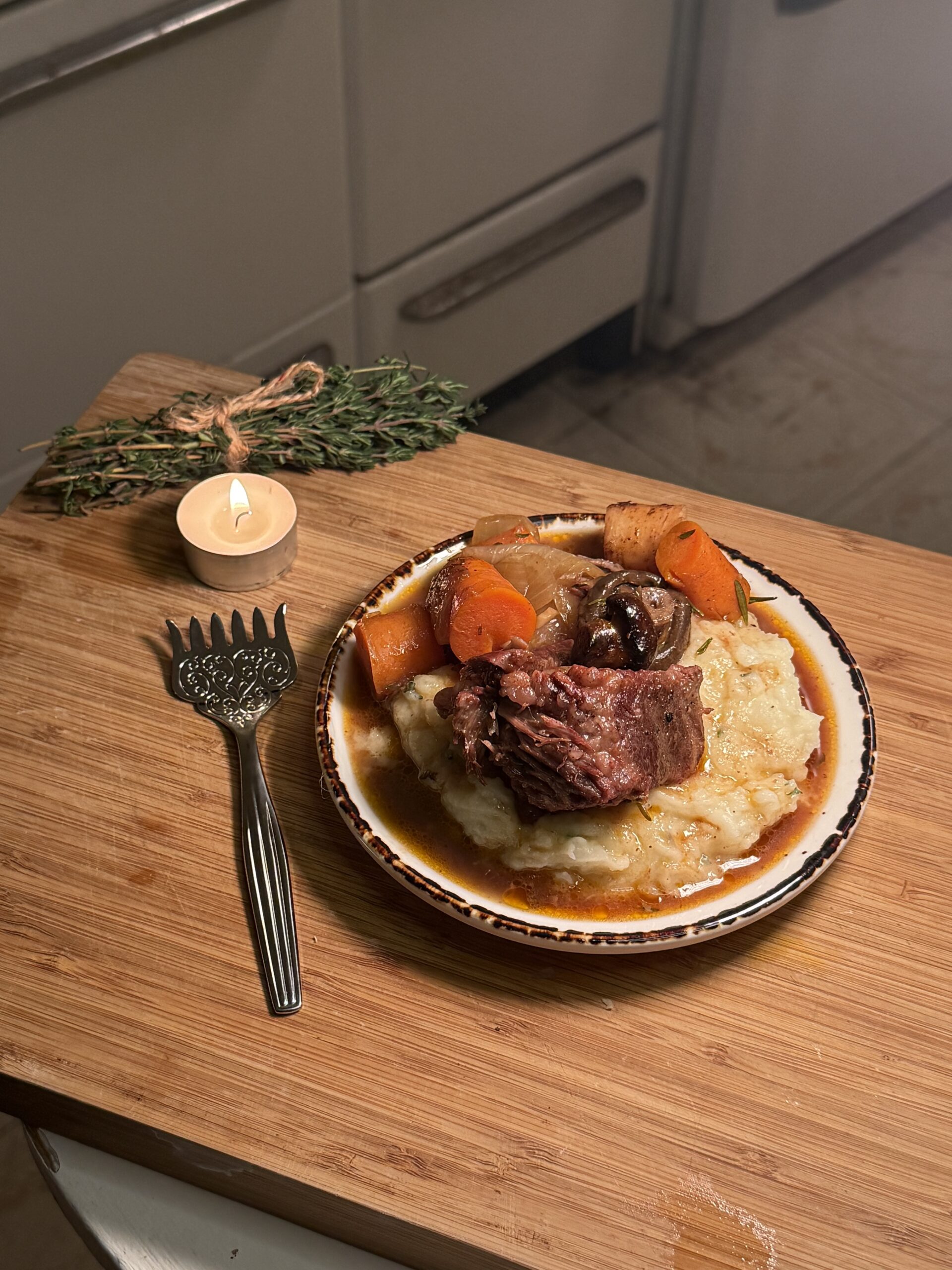 This dish is especially beloved during the colder months — when the air turns crisp, the days grow shorter, and hearty meals call everyone back to the warmth of the hearth. It’s a classic choice for late autumn and winter feasts, making it perfect for Thanksgiving, Yule, or any holiday gathering where comfort and abundance take center stage. The ale-braised beef and root vegetables embody the spirit of the harvest season, while the creamy herbed potatoes bring that cozy, nostalgic touch of home-cooked tradition. In the tavern, it’s often served during festival nights or winter banquets — a celebratory meal meant to nourish weary travelers and mark the turning of the year with good food and good company.