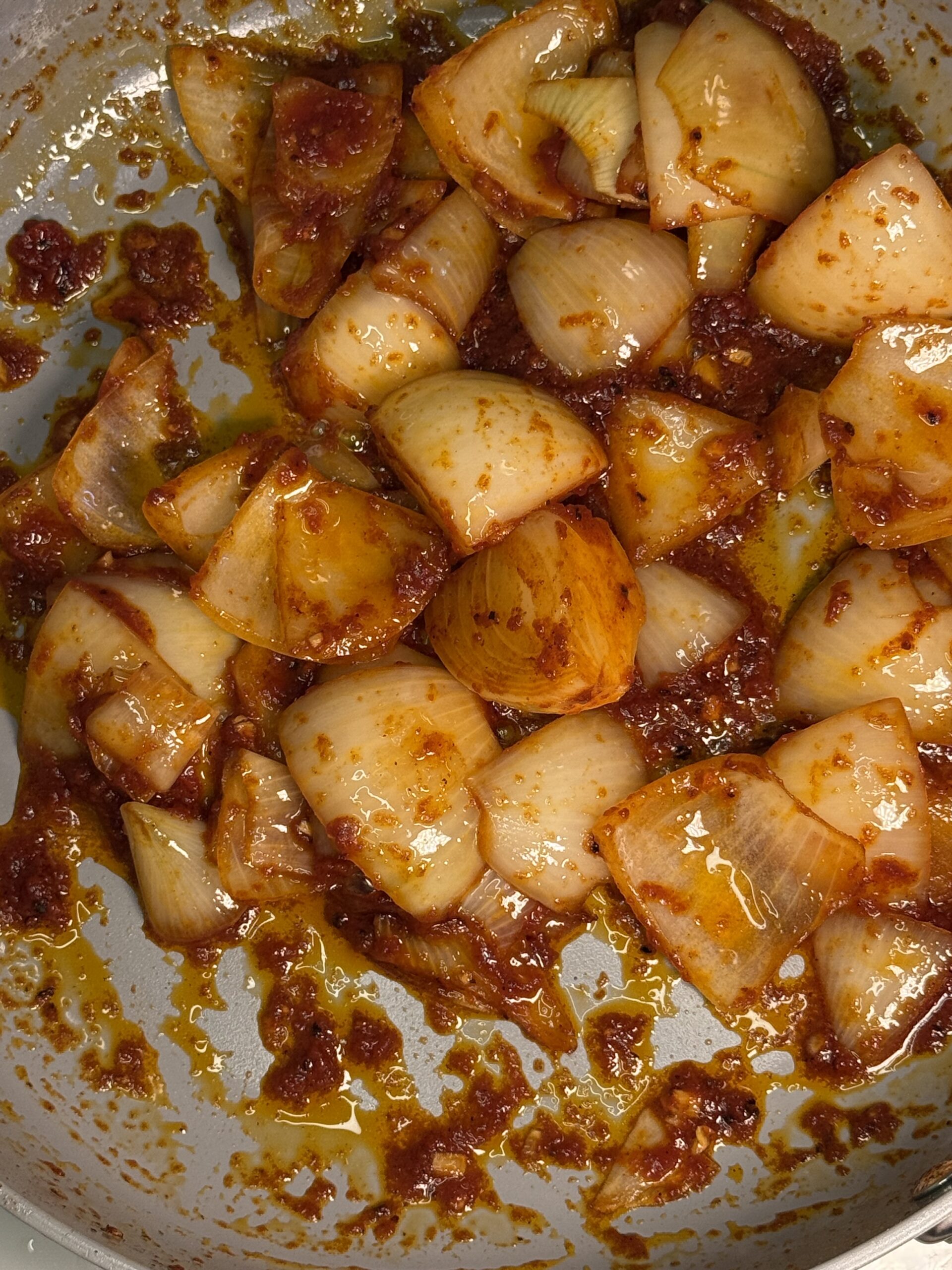 - Add tomato paste and cook for 1–2 minutes to deepen flavor.