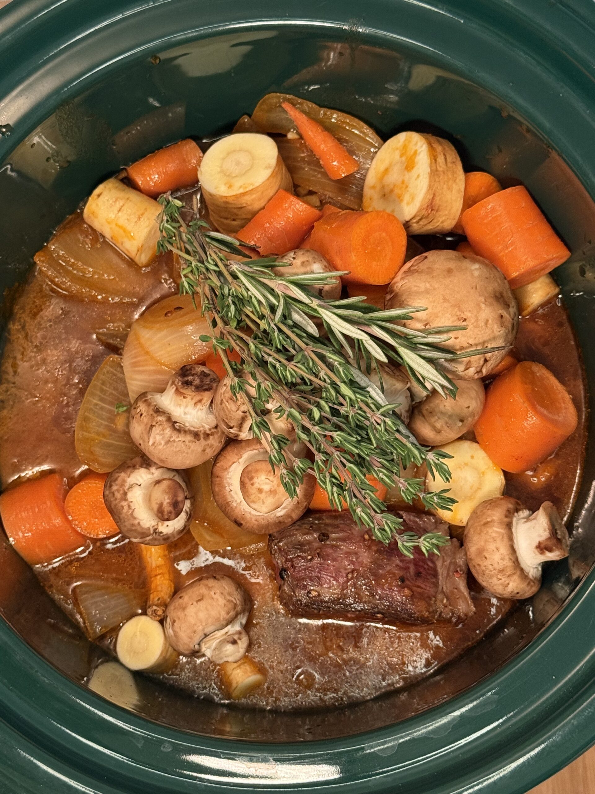 - Cover and cook on low for 8 hours or high for 4–5 hours, until beef is fork-tender and vegetables are cooked through.