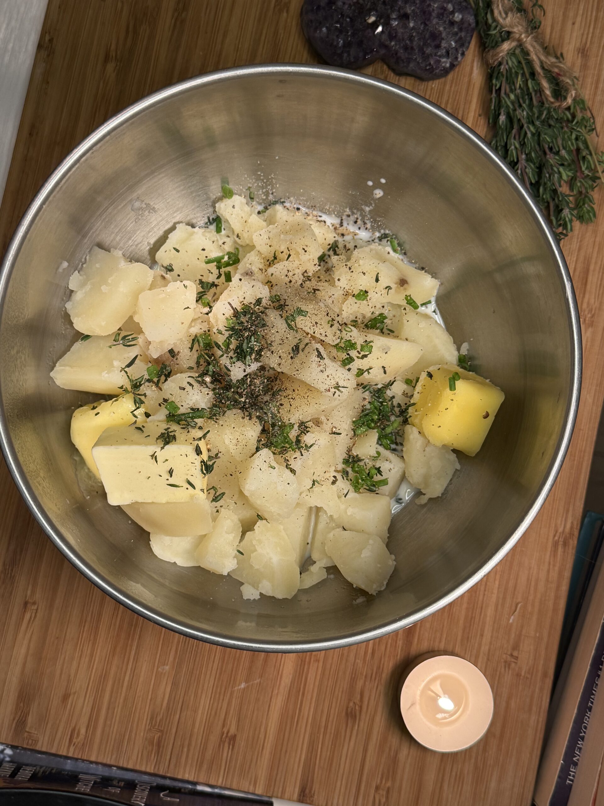 - Drain and mash with butter, milk/cream, and chopped herbs.