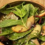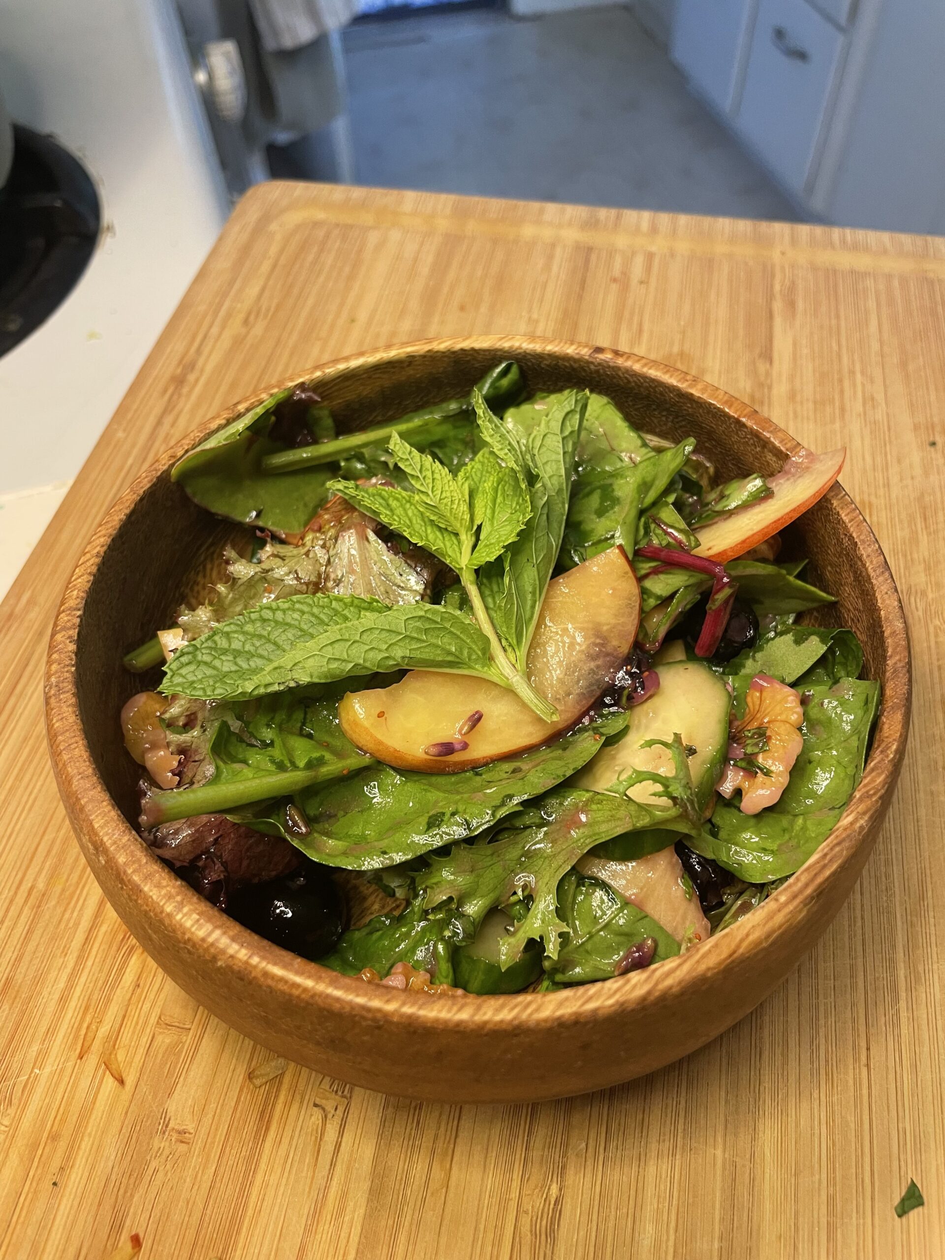 1. Step 2: Build your elven salad In a large bowl or on a wooden platter, gently toss your baby greens with the sliced nectarines, cucumber, and blueberries. Tuck mint leaves throughout like hidden forest herbs.