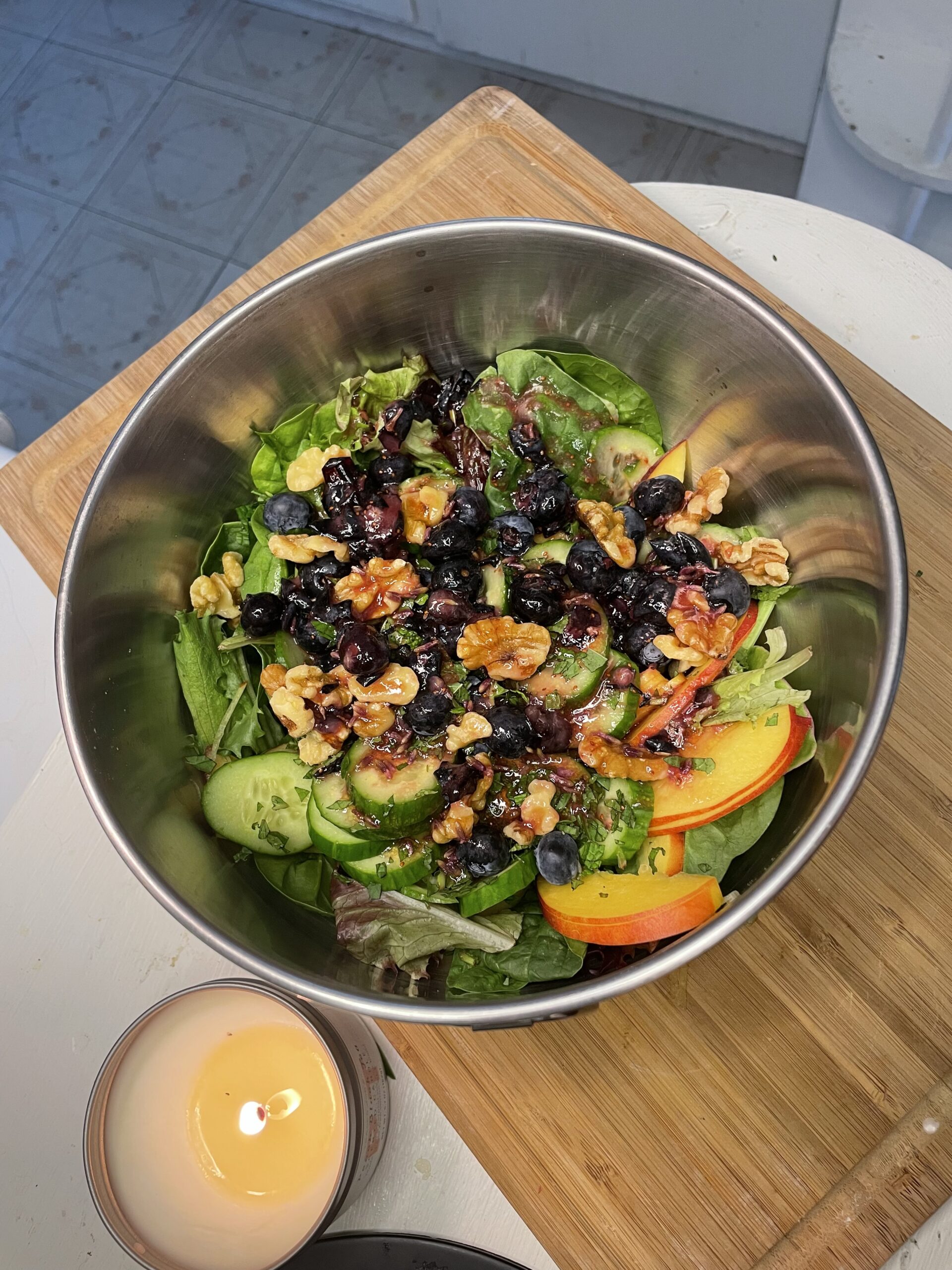 • In a large bowl, gently toss your baby greens with sliced nectarines, cucumbers, and blueberries. Add mint leaves.