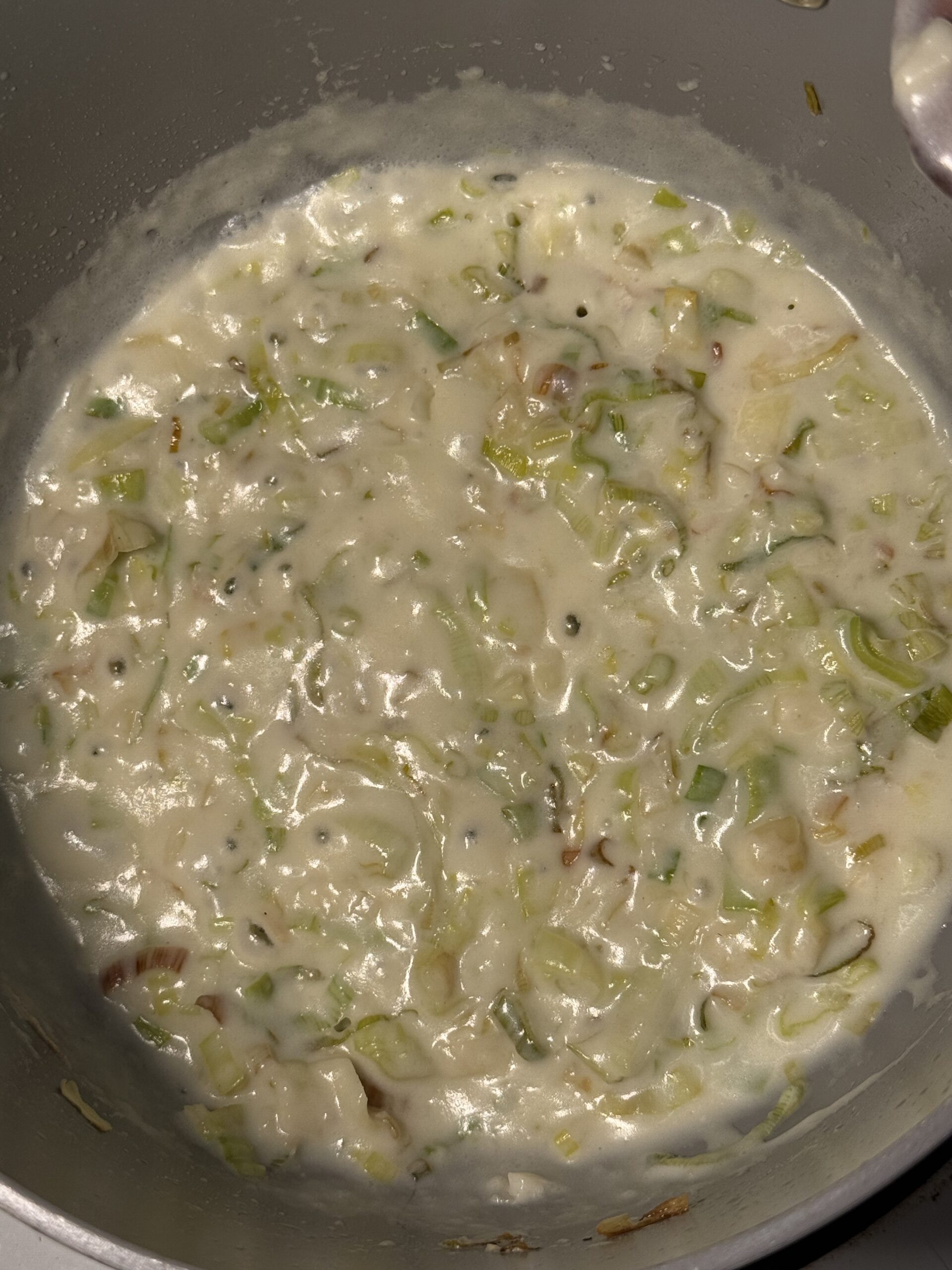 - Sprinkle flour over leek mixture and stir to coat. Slowly pour in milk and cream while whisking to avoid lumps. Simmer 2–3 minutes until slightly thickened. Add cheddar, Havarti, cream cheese, and Dijon. Stir until smooth. Season with salt & pepper.