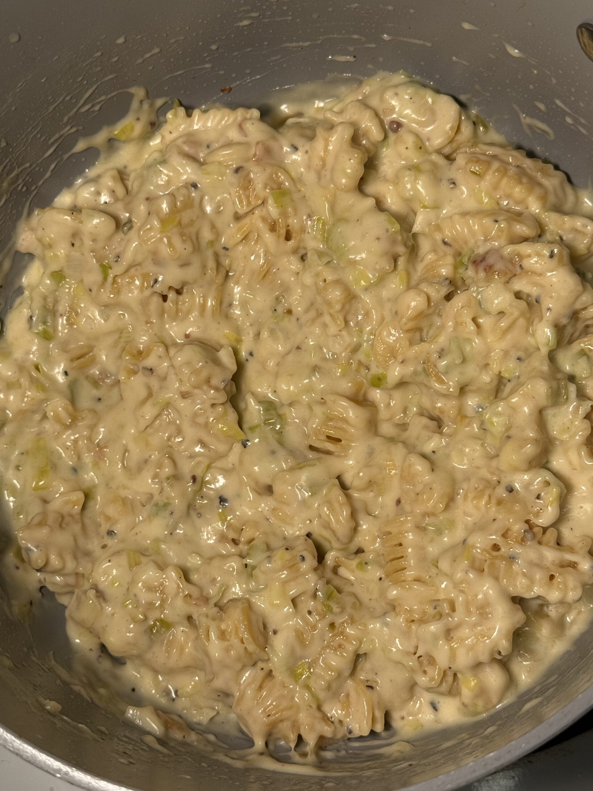 - Stir flour into the leek mixture, whisk in milk and cream, and simmer until thickened. Add cheddar, Havarti, cream cheese, Dijon, and seasonings; stir until smooth. Fold in the cooked pasta.