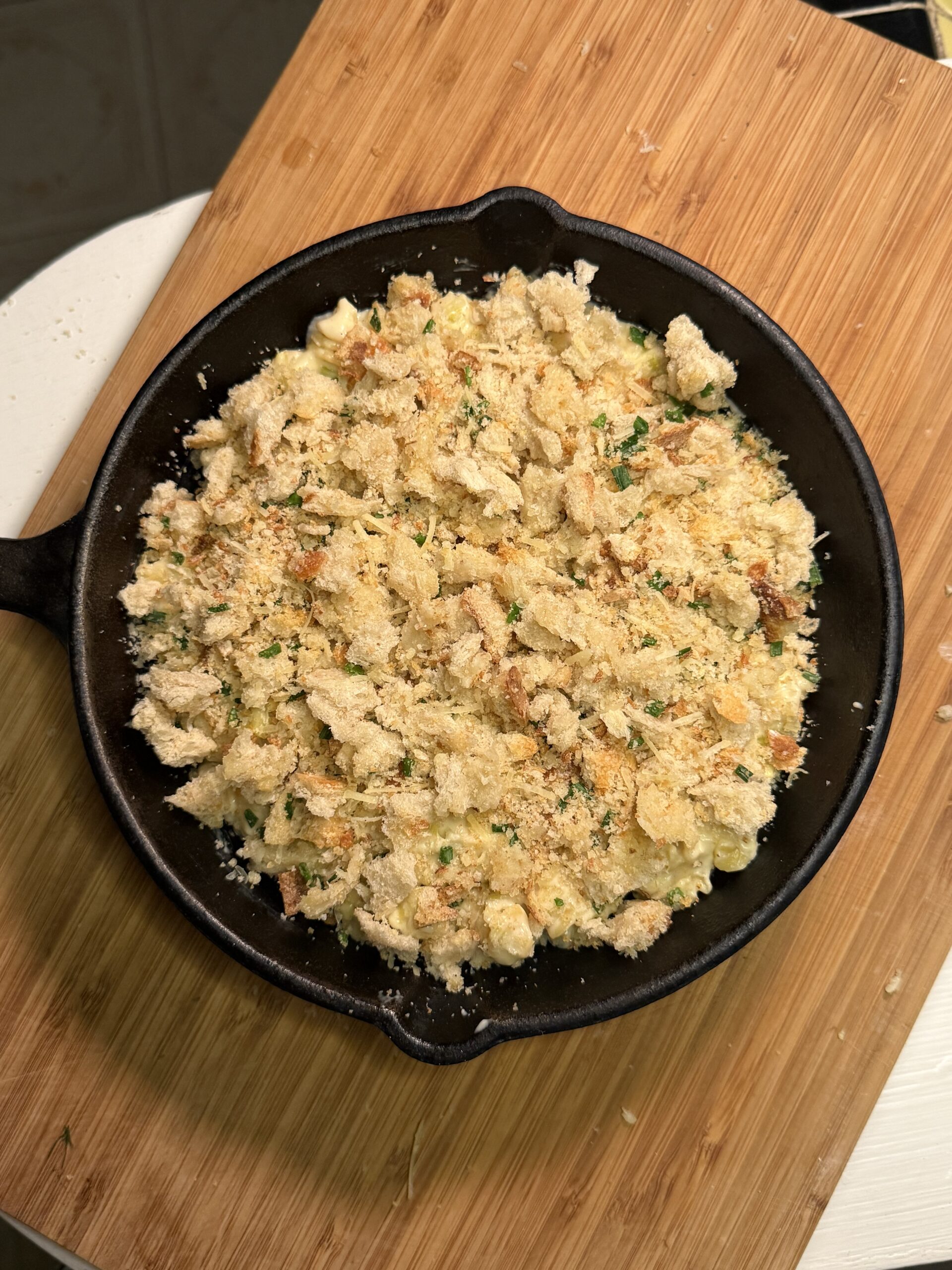 If you’re out of bread, crushed Ritz, saltines, or panko crumbs make a fantastic topping — just mix with melted butter and herbs.