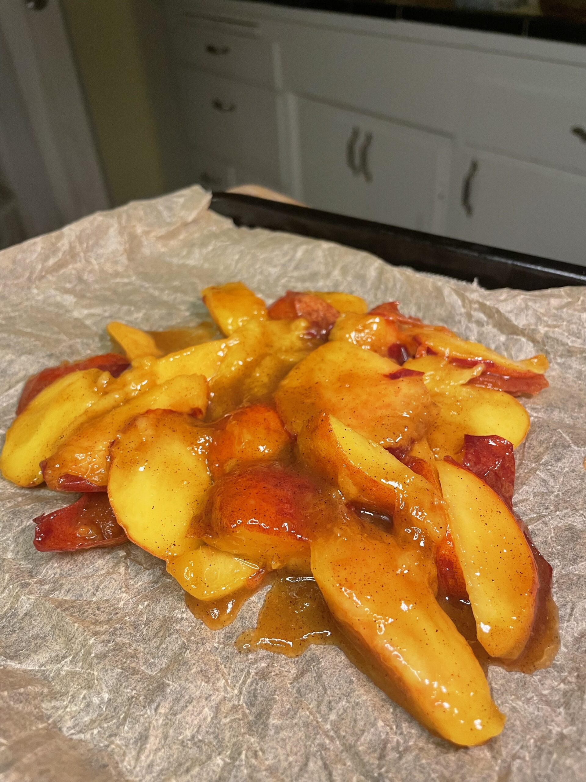 • Slice peaches into wedges and douse them in the mixture. Place the peaches on a baking sheet lined with parchment paper, drizzle any remaining mixture on top.