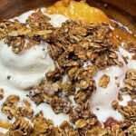 Sweet, tender peaches roasted to caramelized perfection, topped with crunchy toasted granola and creamy vanilla bean ice cream—a cozy, magical dessert that warms the soul.