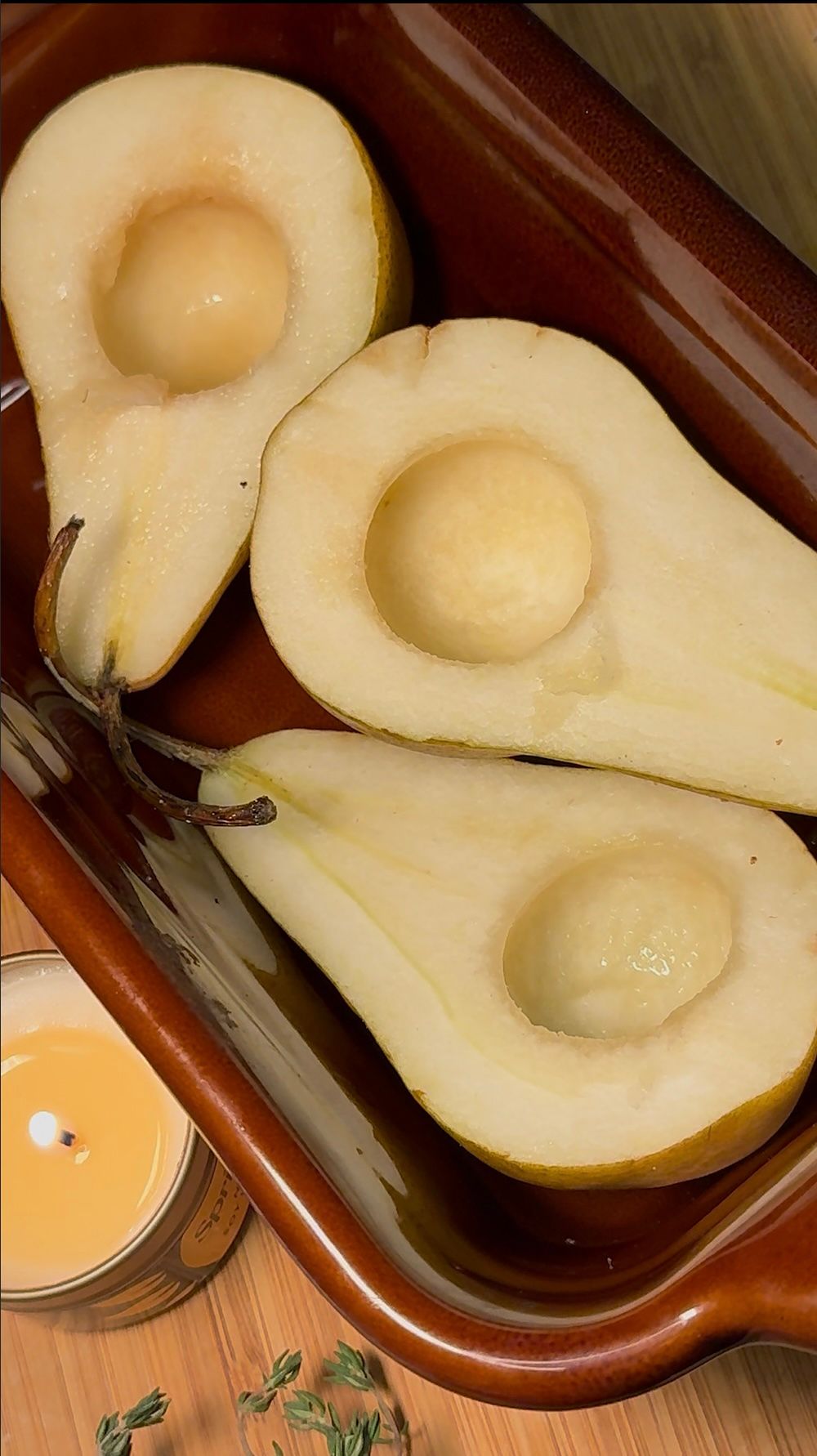 - Roast uncovered for 25–30 minutes, until the pears are tender and caramelized, basting once halfway through with the pan juices.