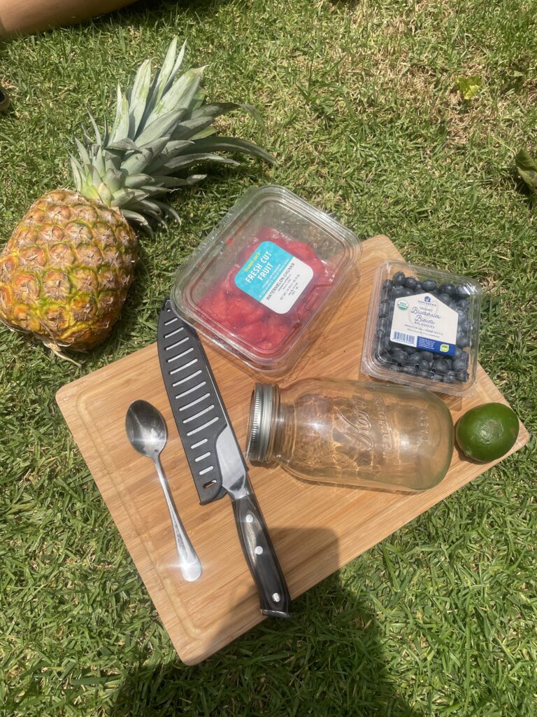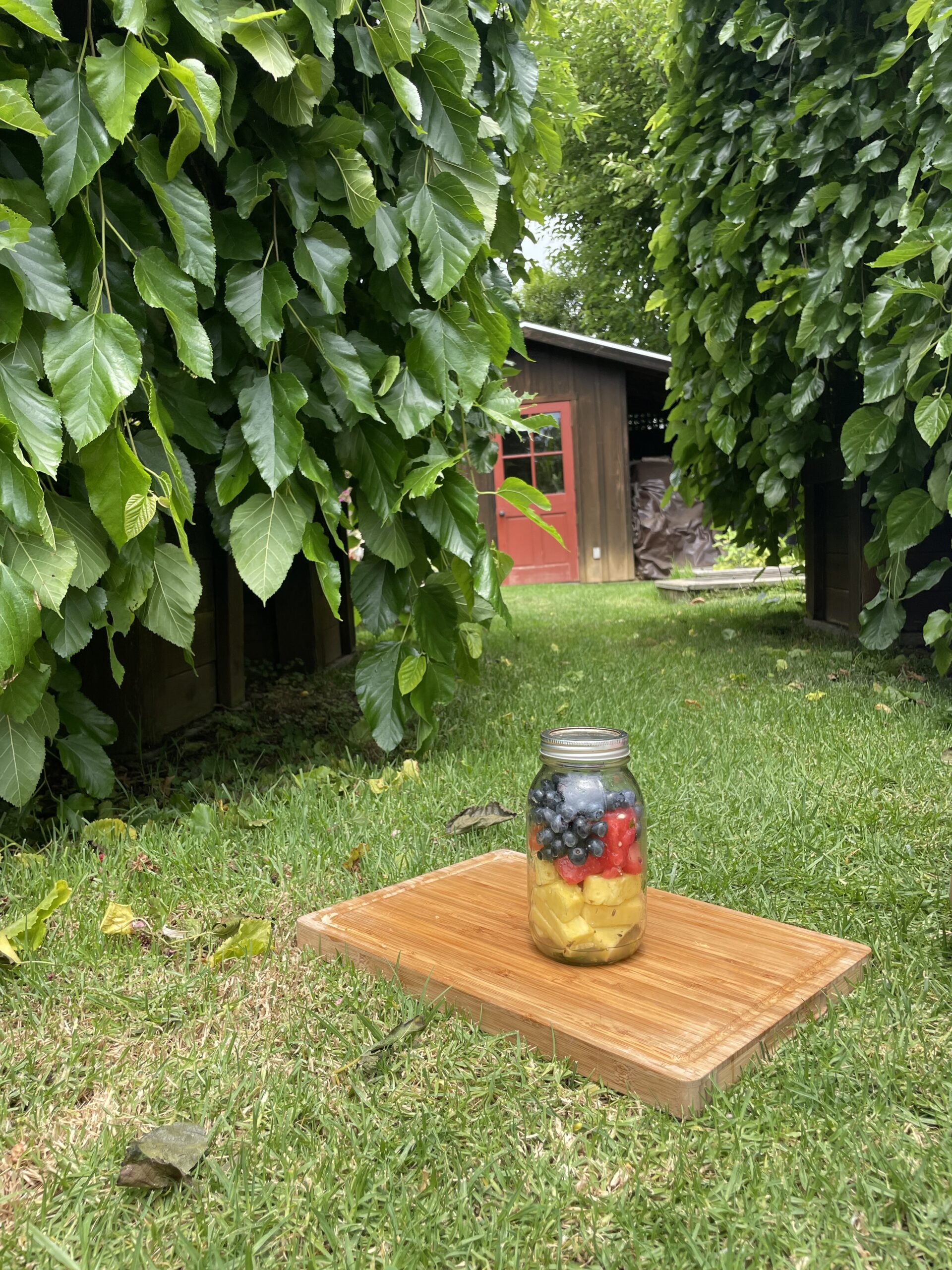 In a green field with large, leafy trees in the background, there a wooden cutting board with a large clear jar with cubed pineapple at the bottom, cubed watermelon in the middle and blueberries at the top. There is a small shed in the background with dark brown wood and a brick-red door.