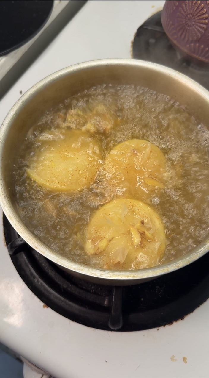 1. Add ginger, lemon, ACV and cayenne to a pot of boiling water and let boil for 15 minutes.