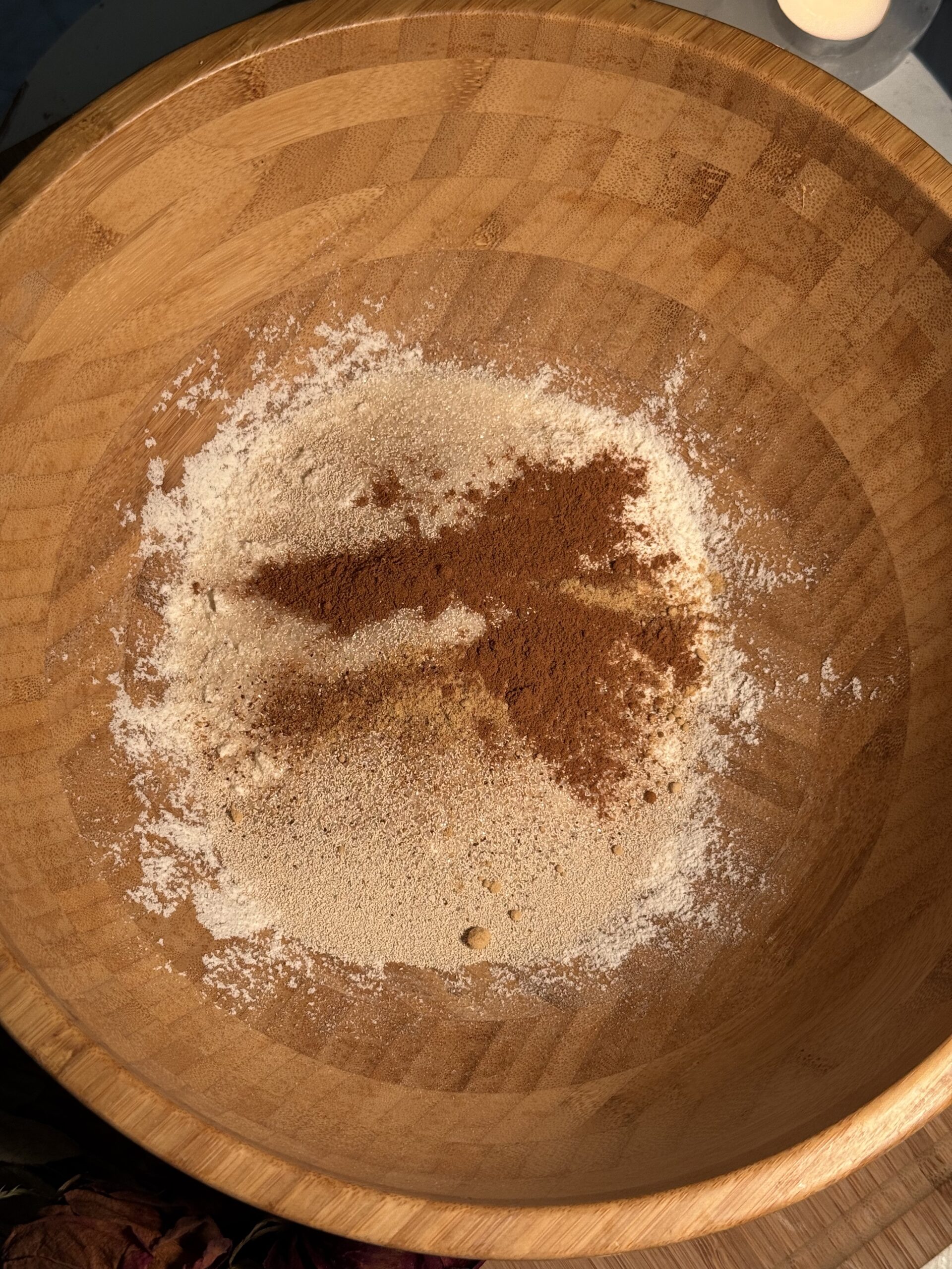 • Make the Dough: In a large bowl, whisk together 1 cup of flour, sugar, yeast, cinnamon, nutmeg, and ginger. Set aside.