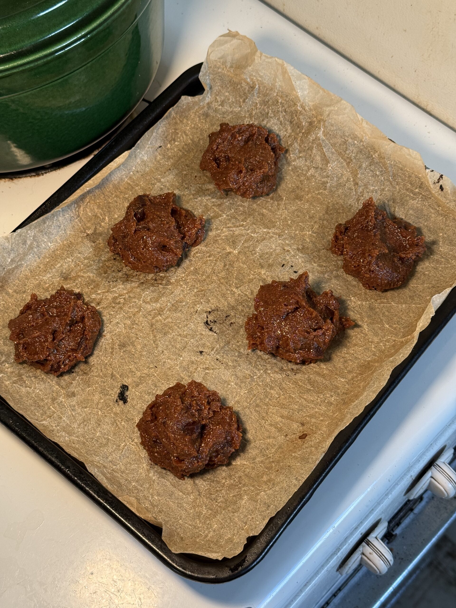 - Shape & bake -- scoop heaping tablespoons of dough onto a parchment-lined baking sheet, flatten slightly. Bake at 350F for 9-11 minutes, until edges are set but centers still look soft. Let cool on the baking sheet for 5 minutes, then transfer to a wire rack.