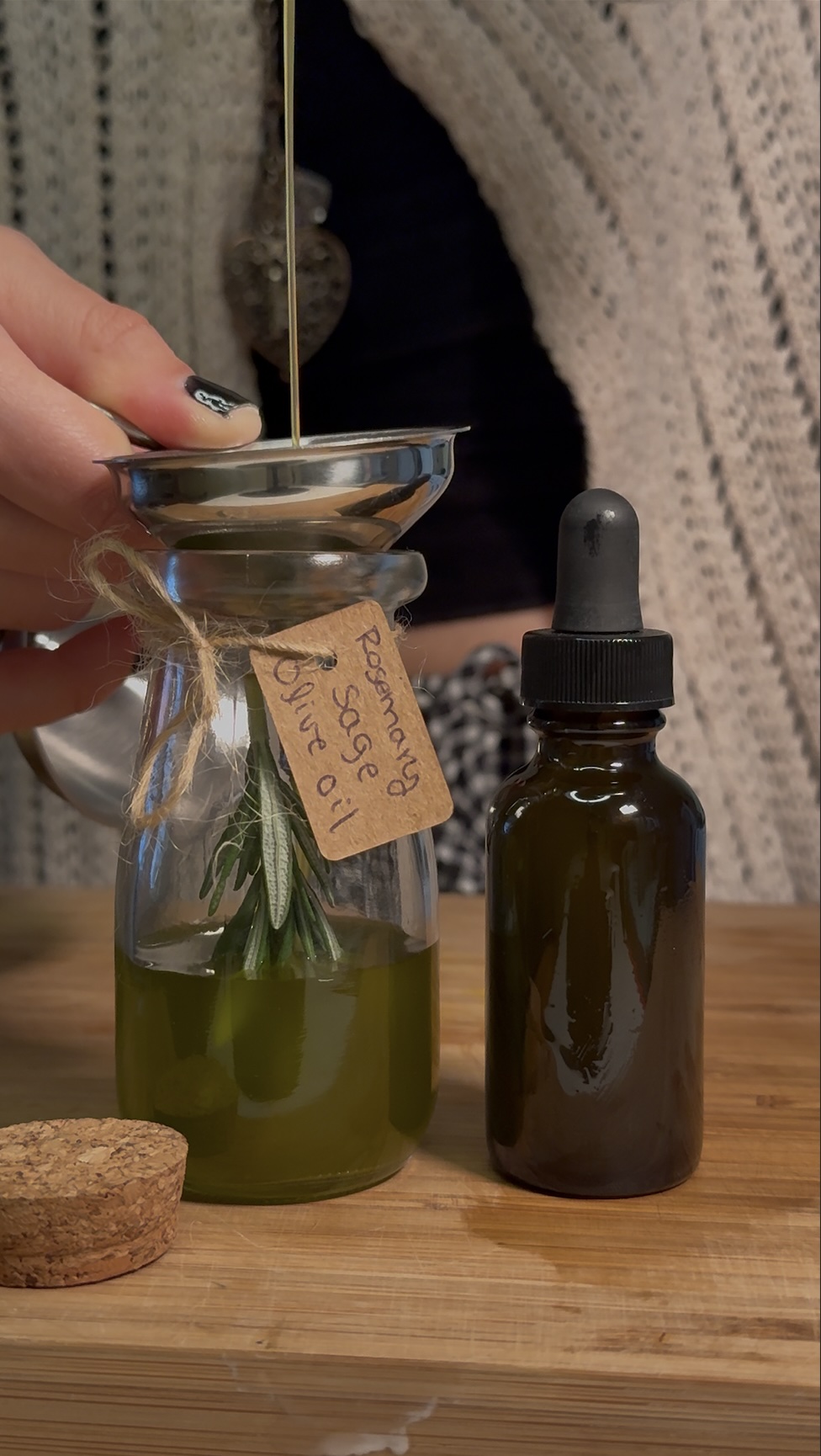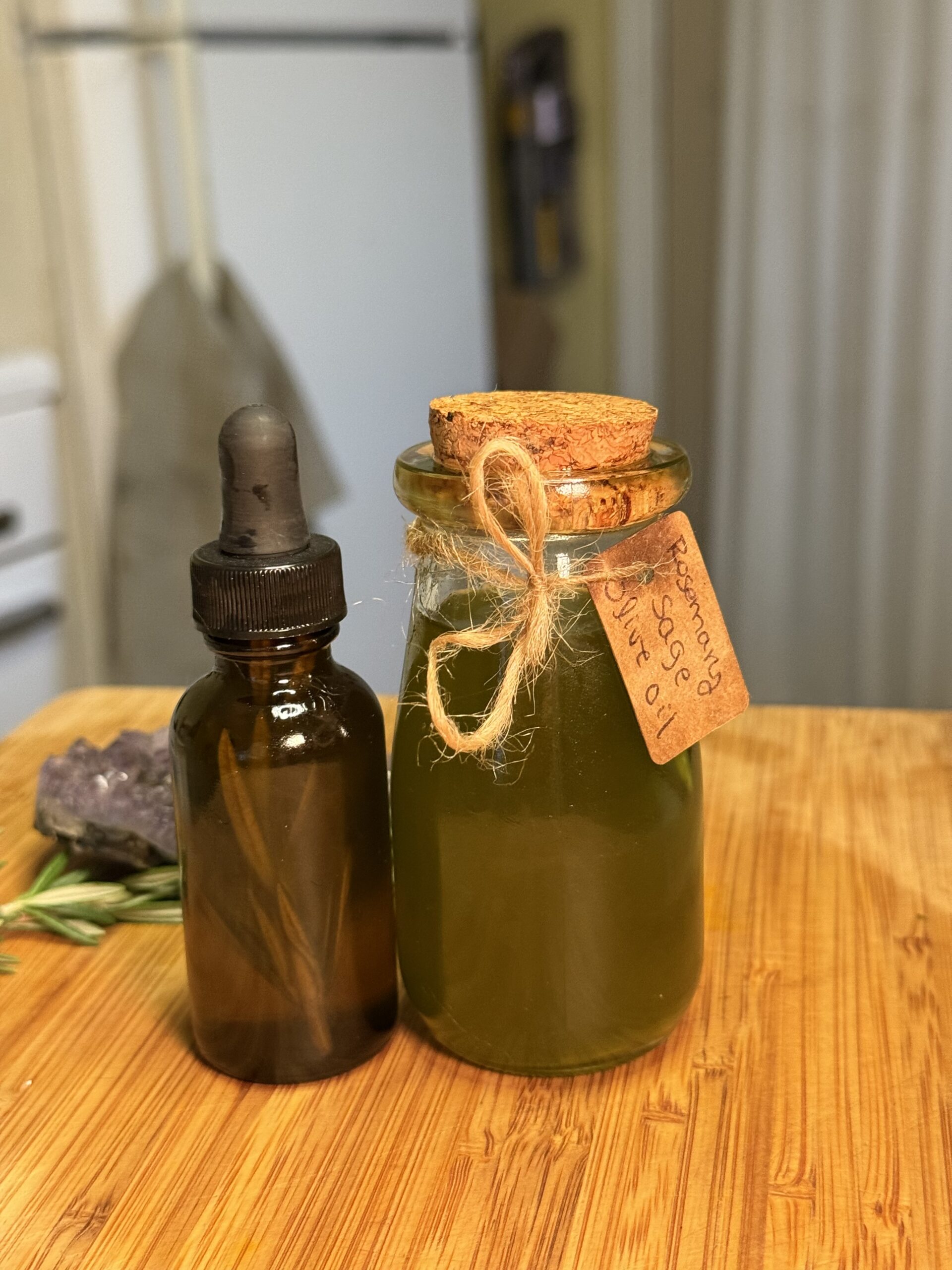 - Separate into two portions:Culinary Oil --** Pour about ¾ of the infused oil into a sterilized jar or bottle.** Label: “Rosemary Sage Olive Oil — For the Hearth.”** Use to cook, or drizzle on roasted veggies, bread, soups, or poultry.Hair Growth Oil -- ** Pour the remaining ¼ of the infused oil into a small dropper bottle.** Add 2 tbsp castor oil and (optional) 2–3 drops rosemary or peppermint essential oil** Shake gently to blend.** Label: “Rosemary Sage Growth Elixir — For the Crown.”
