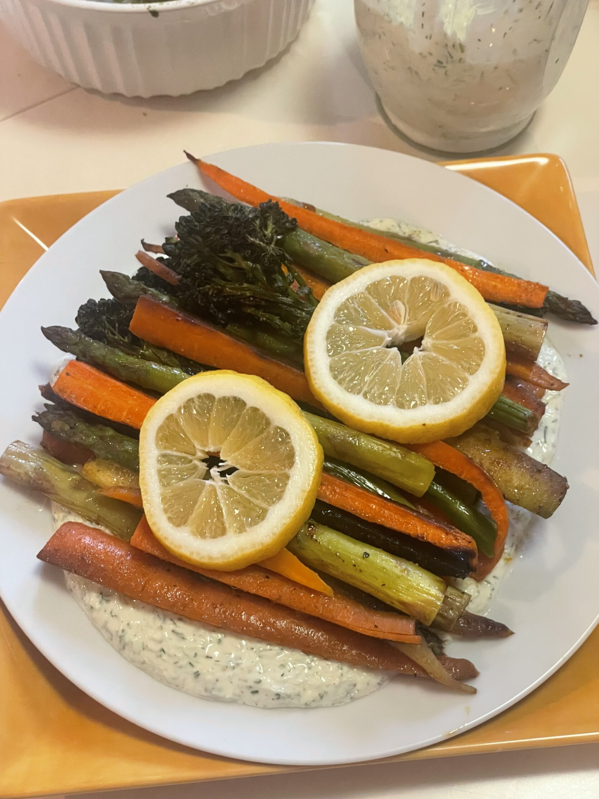 - Toss carrots, asparagus, and broccolini with olive oil, salt, pepper, garlic powder, and paprika. Spread evenly on the baking sheet.