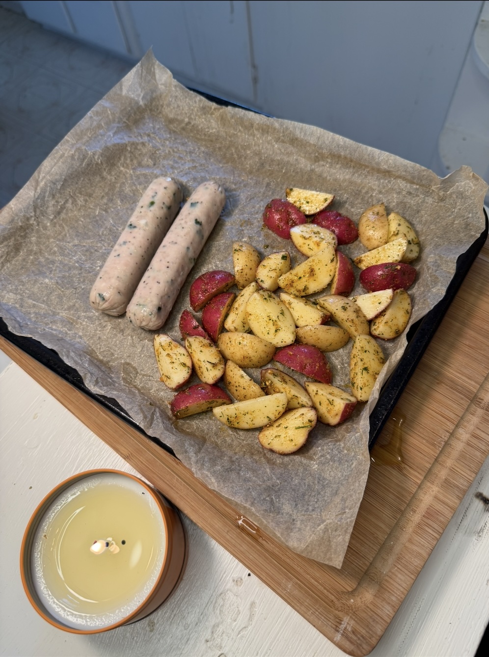• Place the chicken sausages on the same baking sheet during the last 20 minutes of the potatoes cooking time. Bake until browned and heated through.
