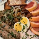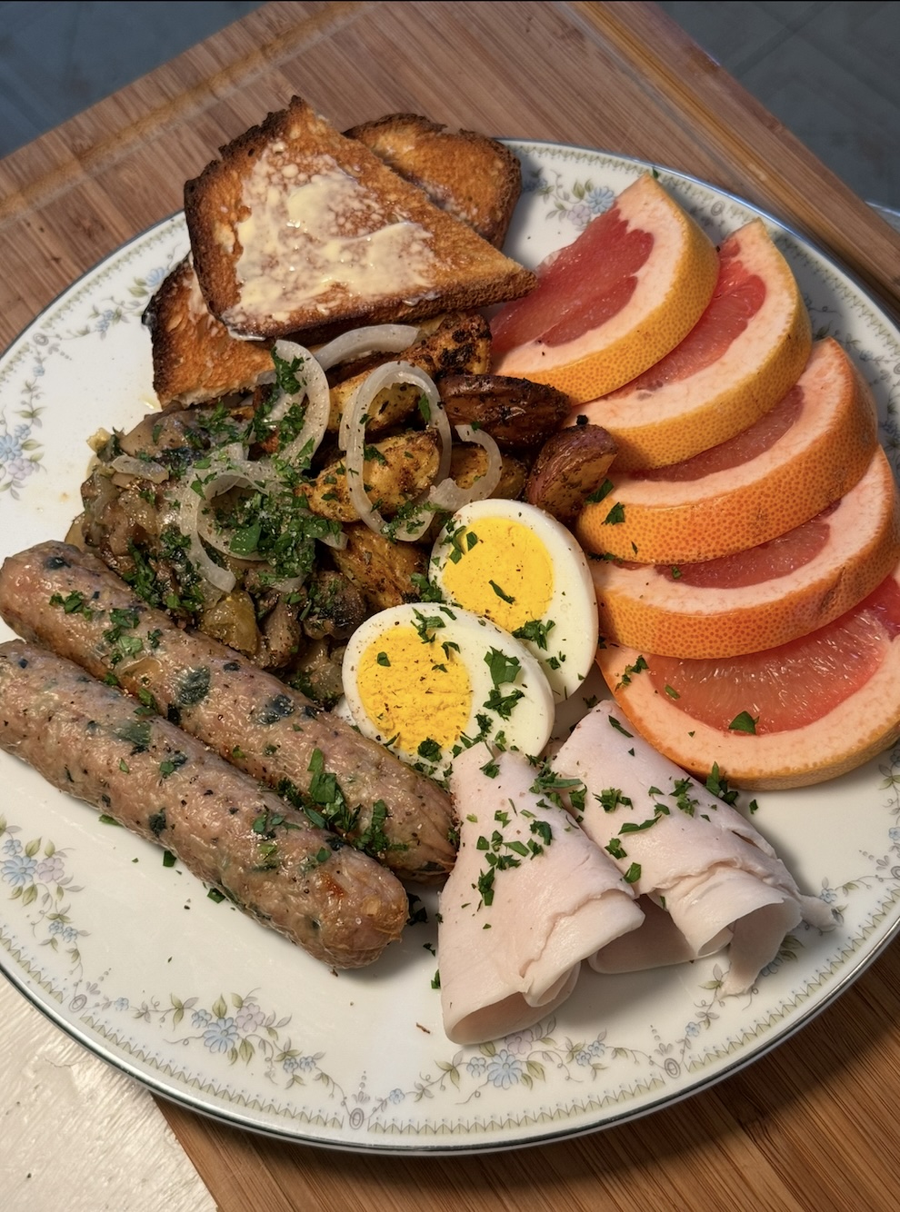 1. Boil eggs for 9–10 minutes, then cool, peel, and slice. Toast sourdough, spread with butter, and drizzle with honey. Arrange roasted potatoes, sausage, mushrooms, turkey slices, and egg halves on a wooden platter. Add the honey toast, grapefruit wedges, and a garnish of parsley and pickled onions for a true tavern flourish.
